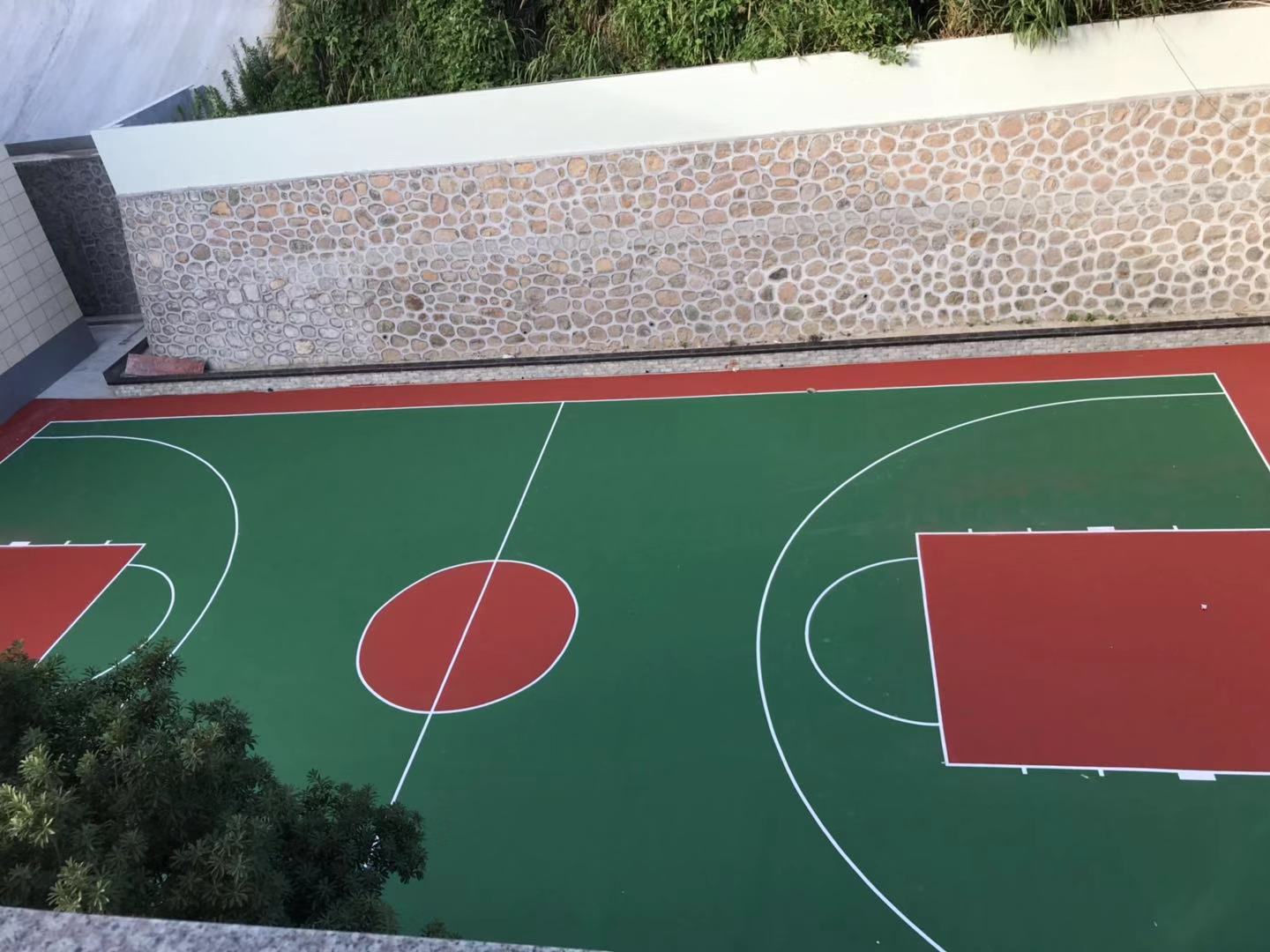 硬质丙烯酸球场施工工艺:基础地坪打磨—修补层施工—渗透底涂层施工—丙烯酸砂浆层施工—丙烯酸中涂层施工—丙烯酸面涂层施工—球场划线,施工层总厚度不小于2MM。